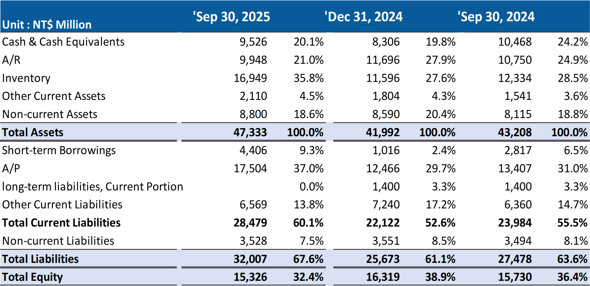 Consolidated net sales for the third quarter of year 2025 were NT$14.7 billion, which represents a 9.6% year-over-year increase compared to NT$13.5 billion for 3Q 2024. Operating profit for 3Q’25 was NT$475.4 million, which represents a 32.3% year-over-year decrease over NT$701.5 million for the third quarter of year 2024. Net income attributable to owners of parent for 3Q’25 was NT$296.3 million, which represents a 45.8 % decrease compared to NT$546.1 million for the 3Q 2024. Based on 295 million weighted average shares, EPS were reported as NT$1.00 for the third quarter of year 2025.