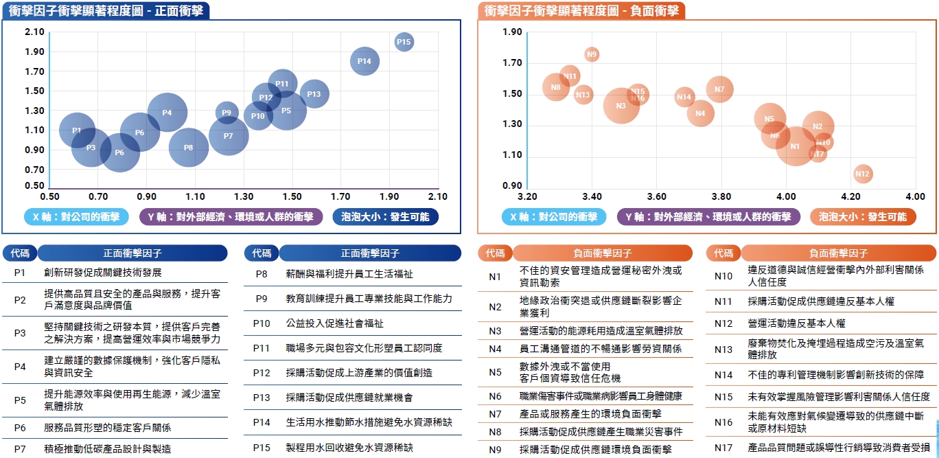 中磊依循GRI 通用準則2021 版的重大性鑑別四大步驟,以「本公司經濟活動對外部經濟、環境、人(人權)所造成的實際或潛在衝擊程度」及「對於本公司永續經營可能產生之影響程度」進行評估,並呼應歐盟雙重重大性原則 (Double Materiality) ,將利害關係人意見納入重大主題鑑別流程,並深化正面與負面衝擊因子的評估面向,使利害關係人與資訊使用者更能瞭解中磊電子在經濟活動過程中,對外部及內部造成之實質性衝擊。2024年重大主題詳見永續報告書。