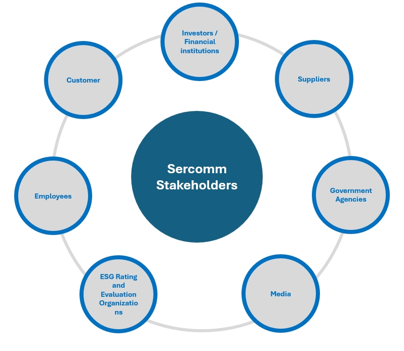 中磊依據產業脈絡與特性彙整利害關係人清單,並參考AccountAbility 組織所發布之AA1000 利害關係人議合標準 (AA1000 Stakeholder Engagement Standard 2015, AA1000 SES) 中的五大原則鑑別關鍵的利害關係人,鑑別結果包括客戶、ESG 評價/ 評級組織、員工、供應商、政府機關、投資人/ 金融機構和新聞媒體等 7 類利害關係人。